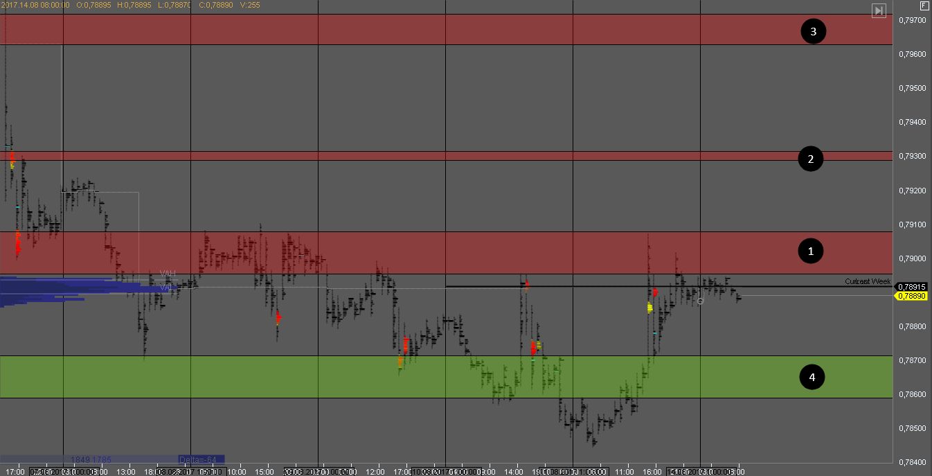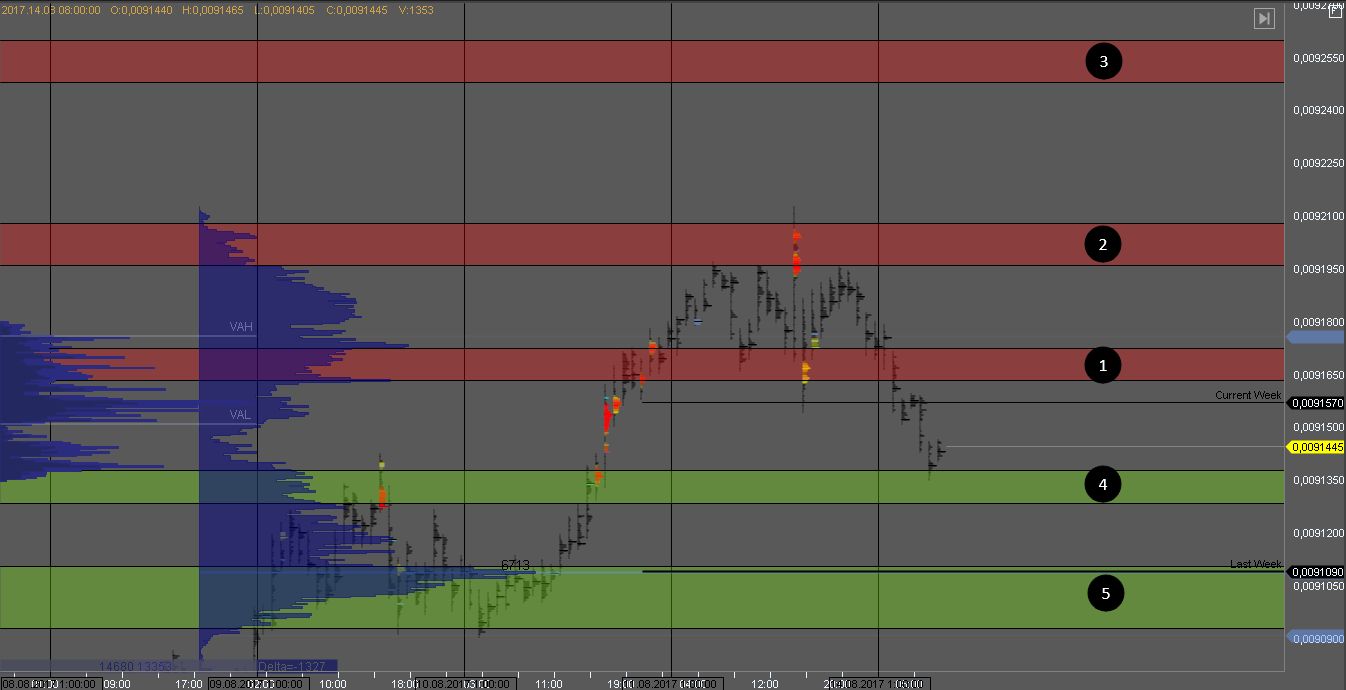 Йена сформировав объем и кластера, перешла в коррекцию под контролем продавца. Зоны 4 и 5 интересны для поиска паттерна на покупку.