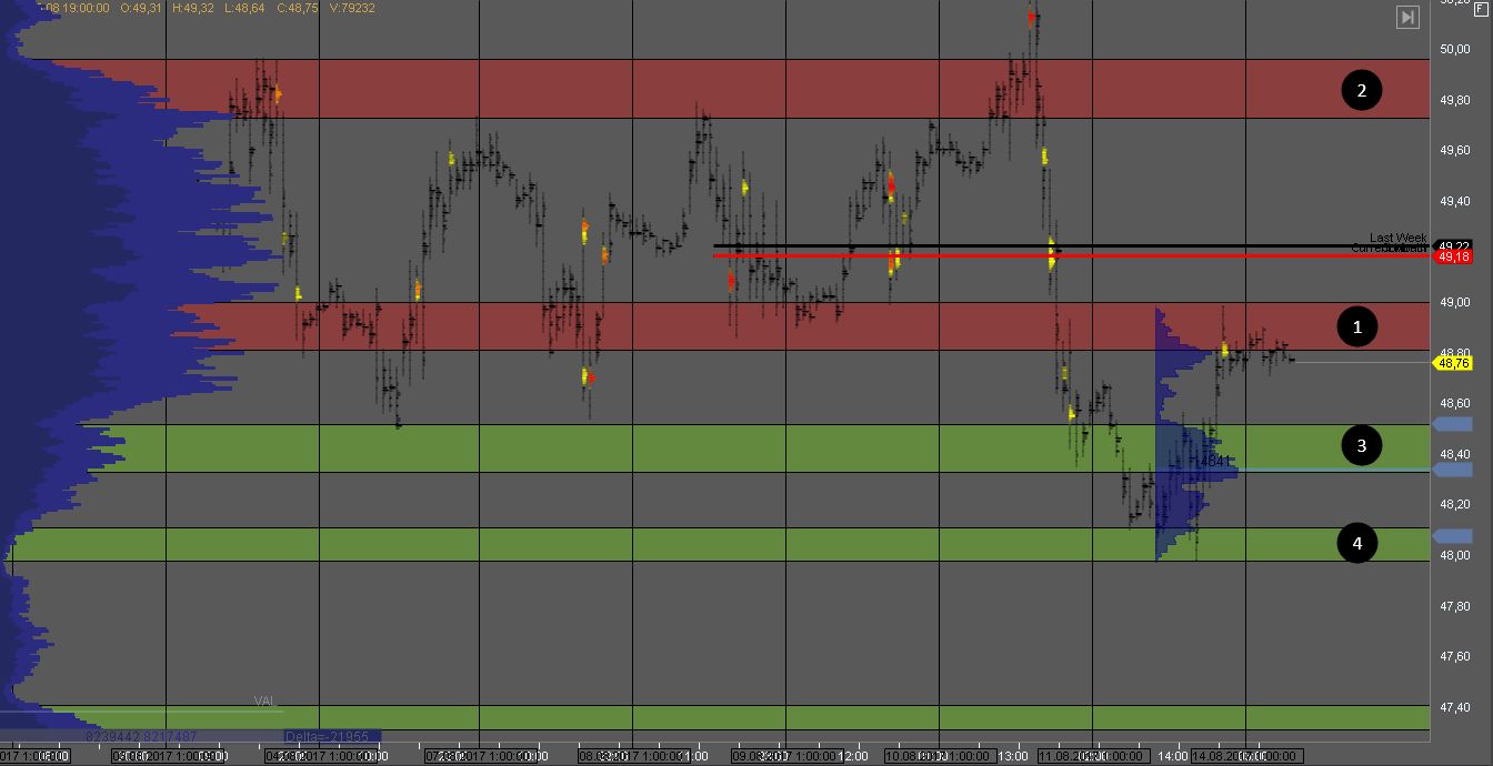 Нефть находиться под контролем коррекционного покупателя с объемом в зоне 3. В зоне сопротивления формируется новый объем. Если покупатель продолжит контролировать рынок, поиск продаж станет рискованным.
