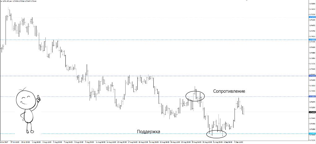 Наблюдая за графиком движения любого рыночного инструмента, в том числе и валютных пар, можно найти большое количество мест, где скапливалось много пиков и впадин, расположенных примерно на одной линии. Такие места называют уровнями поддержки и сопротивления.