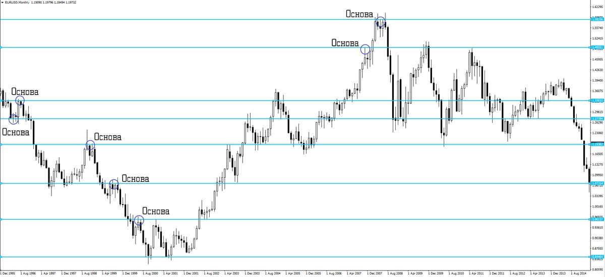 Это хорошо видно, если рассмотреть важные уровни поддержки и сопротивления рынка Форекс на месячном графике пары евро/доллар.