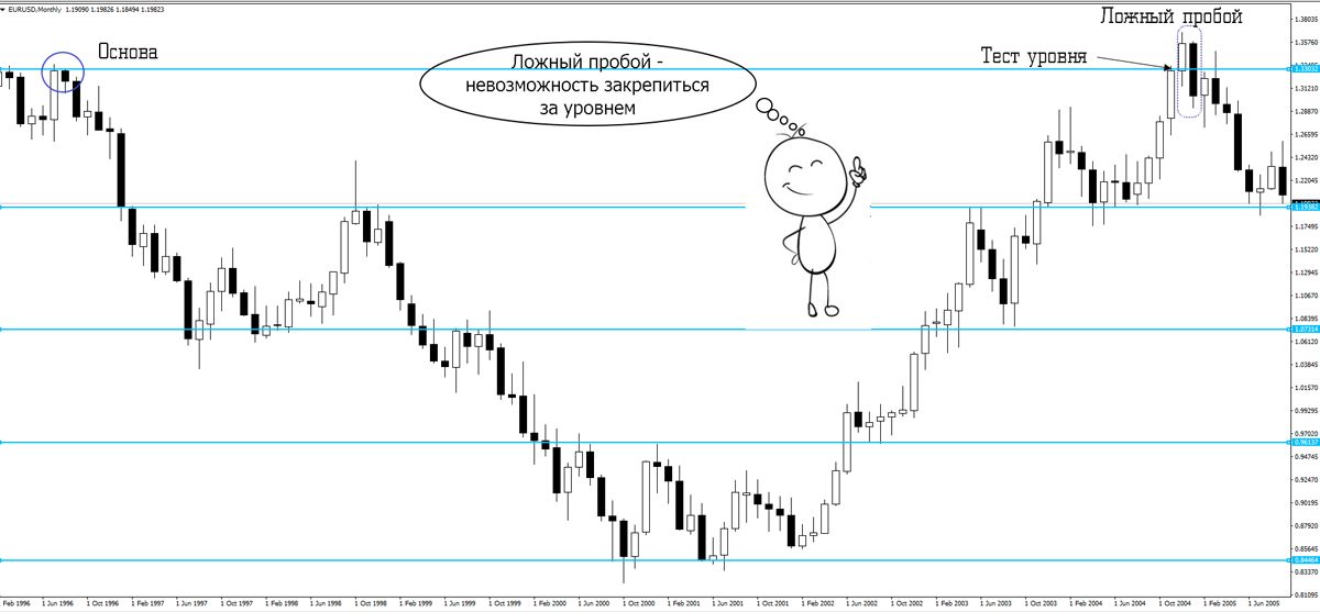 Ложными пробоями считаются те пробои, после которых цена не может закрепиться за уровнем, после чего следует ее возврат. Они случаются по той причине, что крупные участники рынка, набирая большую позицию, охотятся за стопами мелких участников.